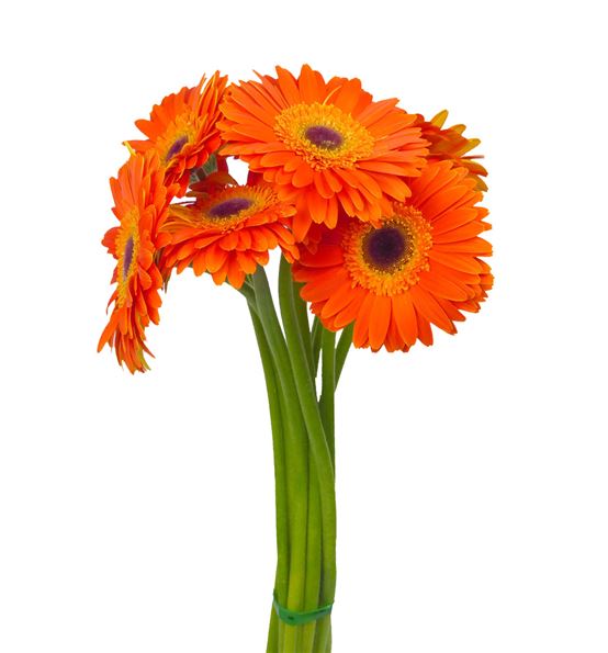 Gerbera varidad dune, de color naranja y con el centro negro. se envían en paquetes de diez tallos de entre 50 y 60 cm de altura.