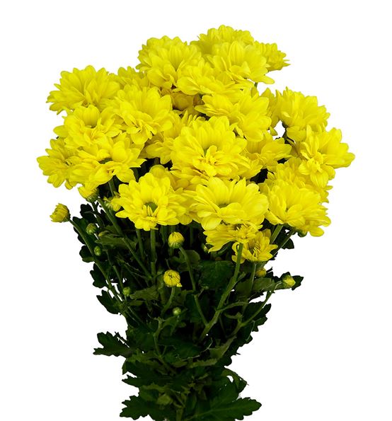 Margarita varidad bacardi de color amarillo envasada en paquetes de cinco tallos de 70 cm de medida. cada tallo posee entre cinco y ocho flores apróximadamente.