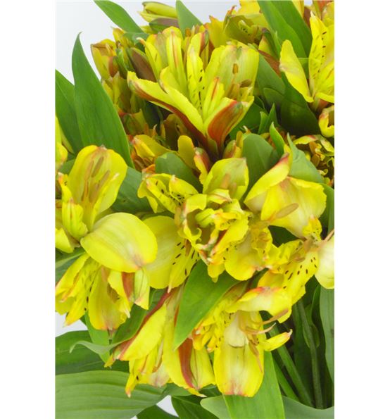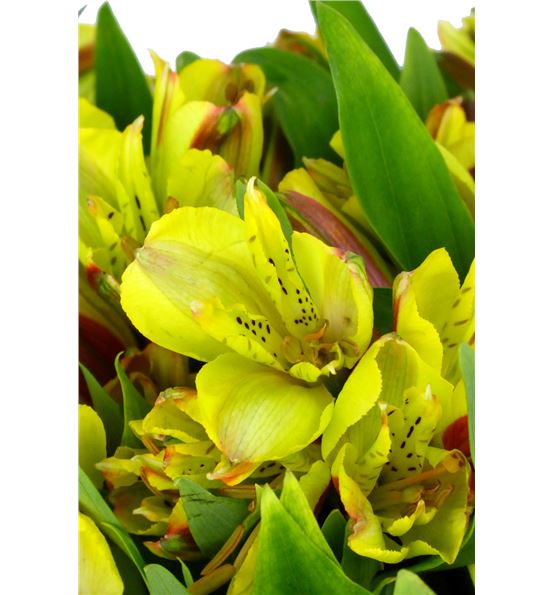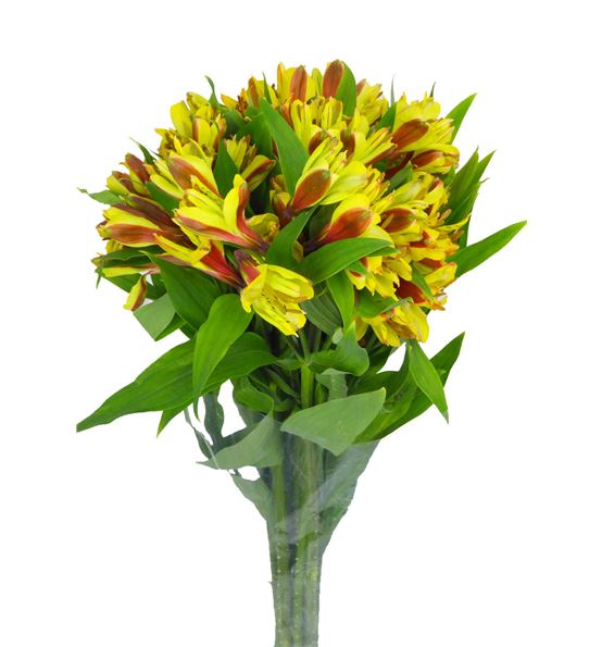 Alstroemeria de colombia en color amarillo. cada paquete se compone de diez tallos de 50 centímetros de medida, y cada tallo tiene de tres a diez flores.