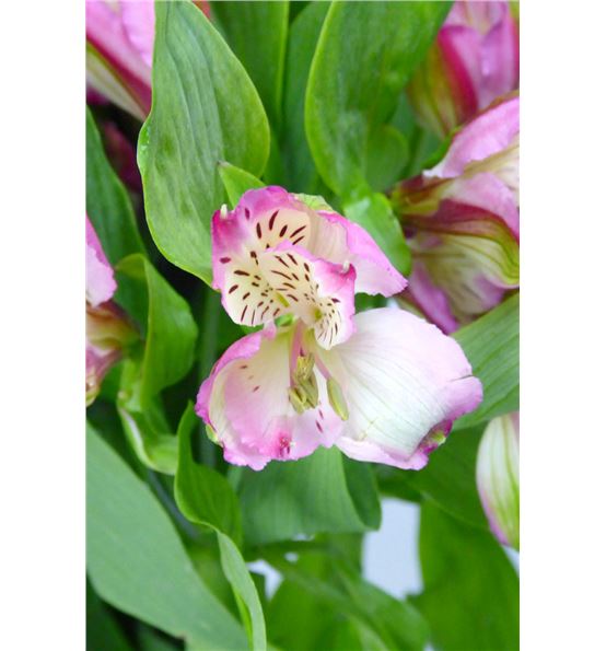 La alstroemeria se caracteriza por ser parecida a un lirio en miniatura. Sus flores se componen de seis pétalos, tres más grandes que se encuentran en la parte exterior y tres en la parte interior más pequeños. Los pétalos de la parte interior tienen marcas negras o marrones y colores contrastantes.