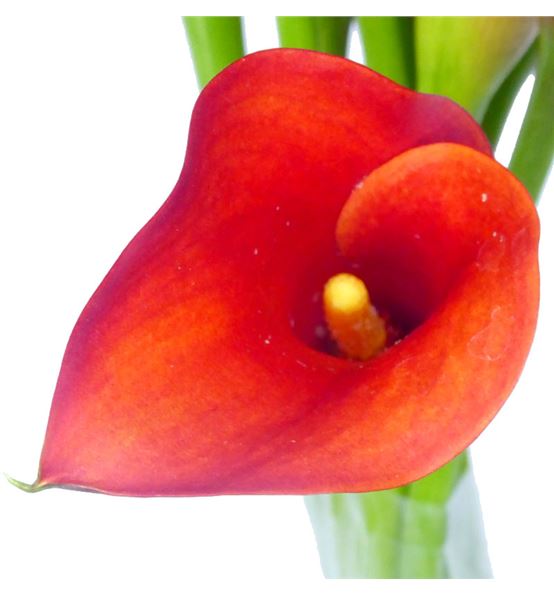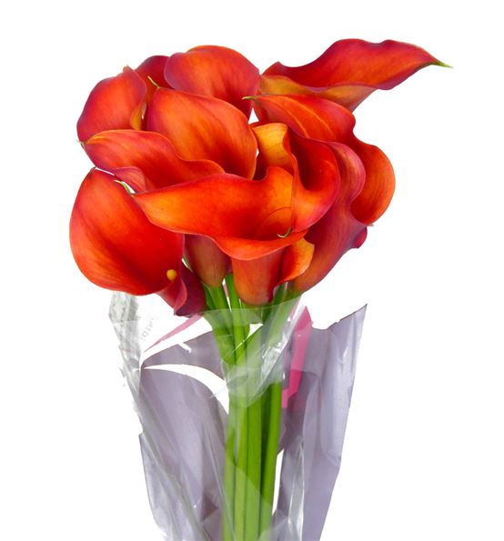 Cala de color naranja y 60 cm de largo. 5 tallos cultivados en holanda.