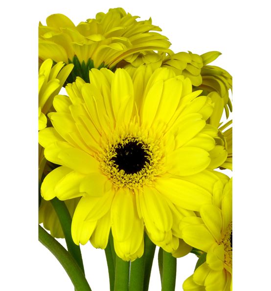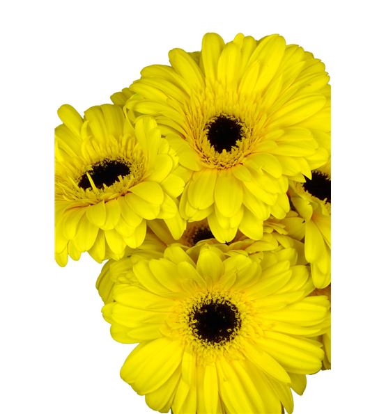 Gerbera varidad brillance, de color amarillo y con el centro negro. se envían en paquetes de diez tallos de entre 50 y 60 cm de altura.