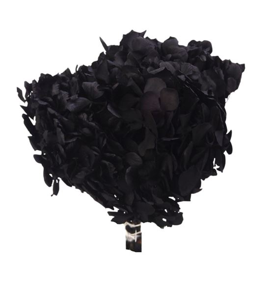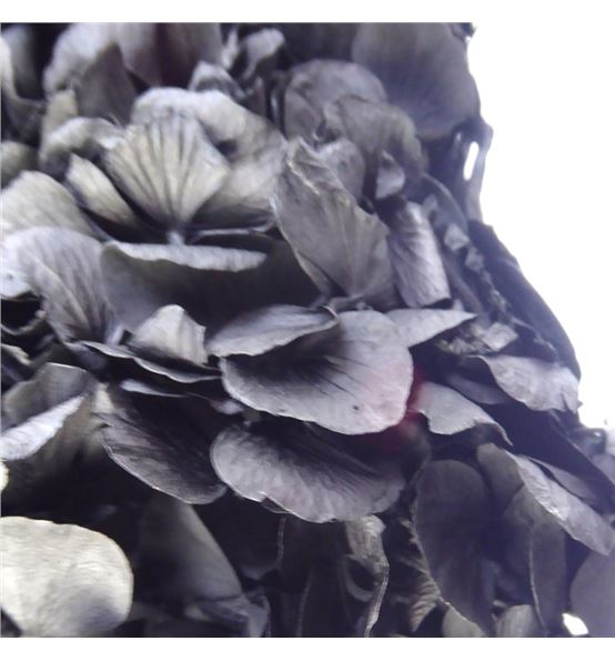 Hortensia preservada sin tallo de color negro. se entrega en manojos de entre 16 a 20 centímetros de diámetro.